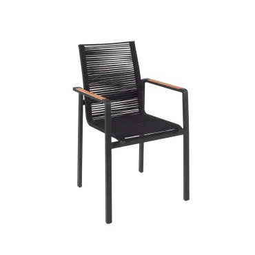 Conception Élégante : Les accoudoirs en teck ajoutent une touche de luxe et de chaleur à la chaise, contrastant magnifiquement avec le cadre noir en aluminium.