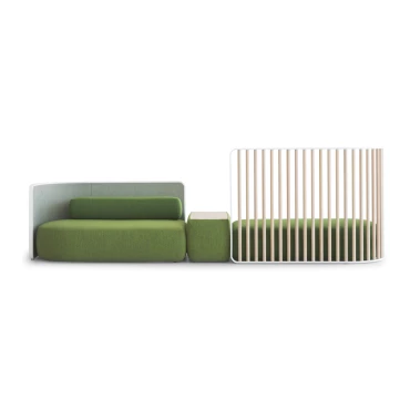 Ce système de sièges modulaires est fabriqué avec une structure en multiplis de bois et une mousse ignifugée en polyuréthane. Les 2 sièges et l'accoudoir sont reliés par des plaques en métal et tous les modules sont dotés de housses amovibles. Le canapé est combiné avec des cloisons Screen et des coussins Oort.