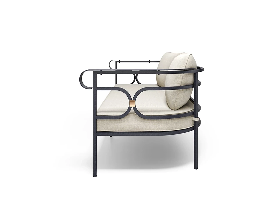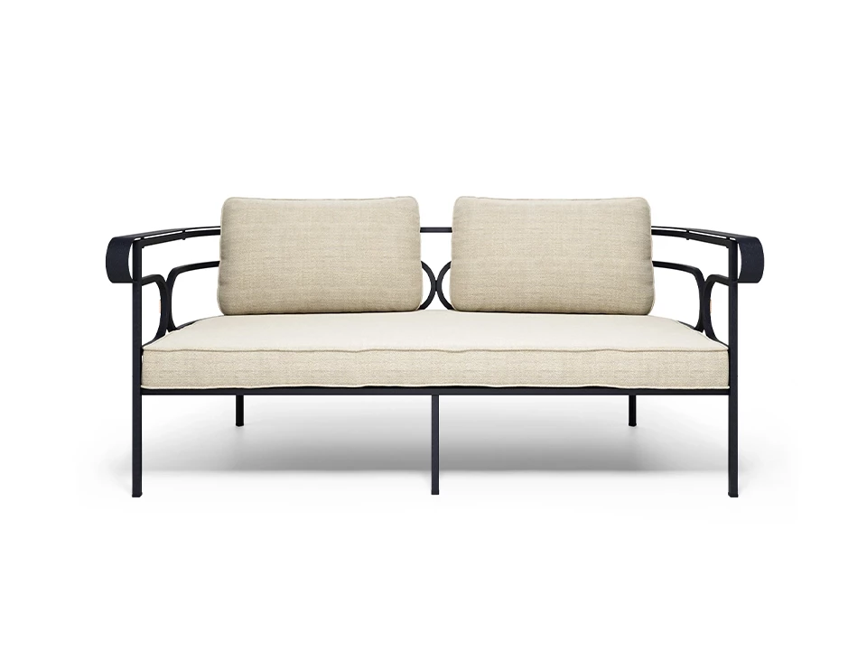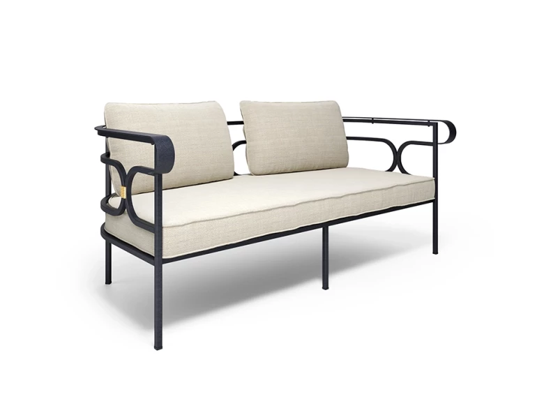 Le choix de la finition fer ancien confère à ce canapé une allure particulièrement noble. Cette teinte signature d'Emu, sombre et subtilement texturée, évoque le charme des jardins d'époque tout en restant résolument moderne. Elle crée un contraste saisissant avec les ornements finition laiton qui habillent les accoudoirs, véritables bijoux dorés qui illuminent la structure sombre.