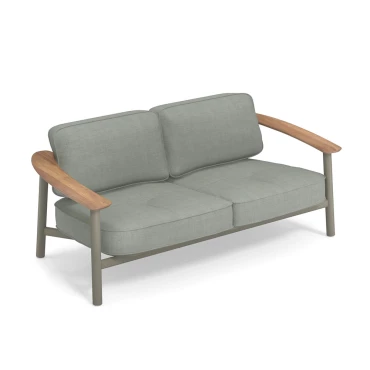 Le mobilier Twins est adapté pour une utilisation en extérieur grâce à ses matériaux résistants et l'utilisation de tissus Outdoor. Le bois est présent à travers une assise et des accoudoirs en teck certifié 100 % FSC.