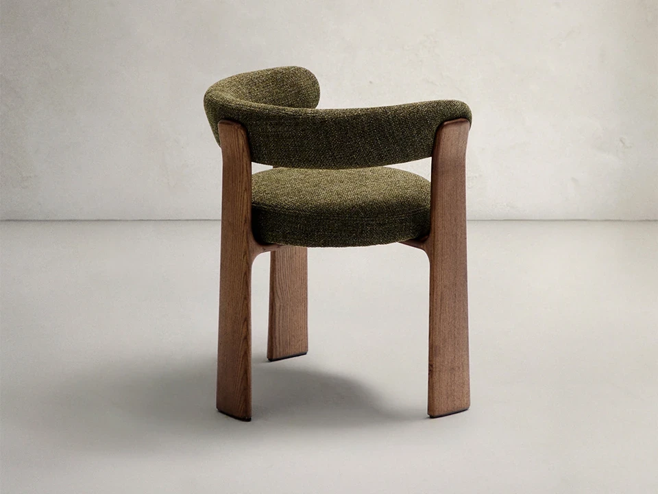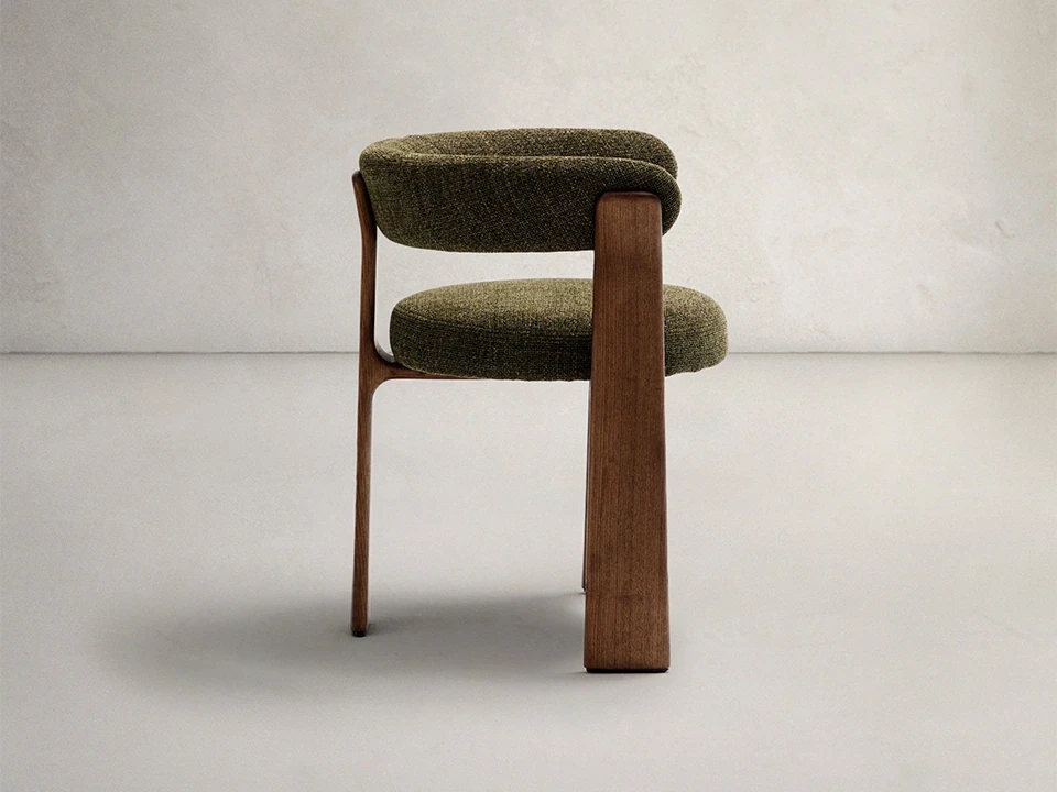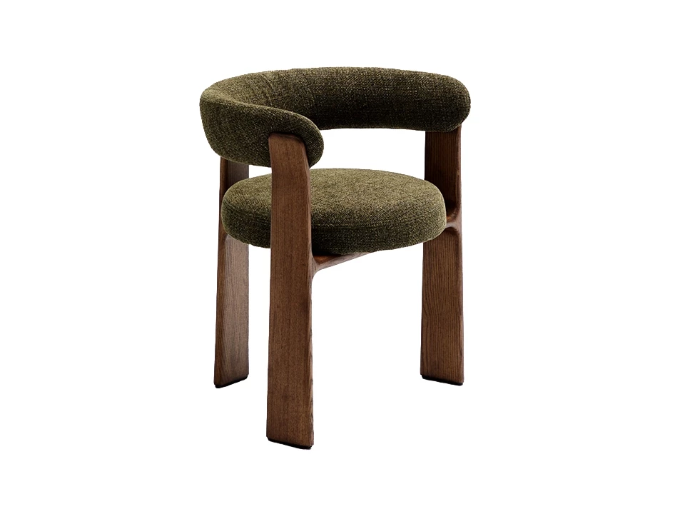 Elle associe une structure originale à trois pieds en bois de frêne (finition foncée) à une assise et un dossier moelleux recouverts d'un tissu chenille vert. Ce mariage de matériaux chaleureux permet à la chaise de s'imposer comme une création esthétique, idéale autour d'une table à manger ou dans un coin lecture.