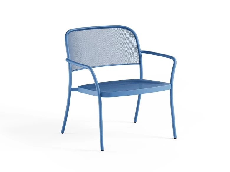 La structure en acier verni est habillée d'une maille en tôle déployée sur l'assise et le dossier. Ce travail de matière offre une transparence visuelle qui allège la silhouette, tout en assurant une excellente aération.