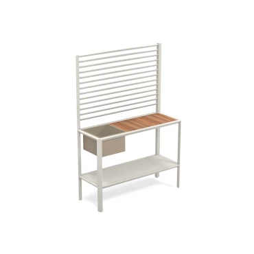 ”Camaleon 5” est une étagère modulable et personnalisable disponible en 2 finitions. Ce meuble dispose d'un espace de rangement avec un plateau en teck, et d'un bac de rangement, idéal pour stocker de la vaisselle directement sur votre terrasse. Ses barres parallèles permettent de suspendre des plantes pour apporter une touche de nature à votre univers. Sa structure est en métal et son plateau en teck naturel, très résistant aux environnements extérieurs.