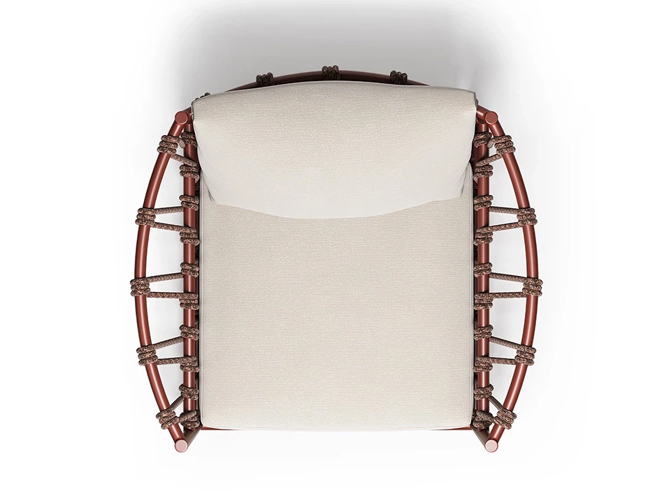 Son atout majeur réside dans son alliance de technicité et d'artisanat : le tressage en corde synthétique, réalisé à la main autour de la structure en aluminium, offre un jeu de transparence élégant qui allège visuellement l'espace.