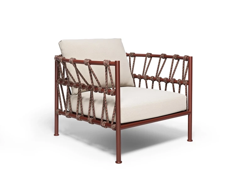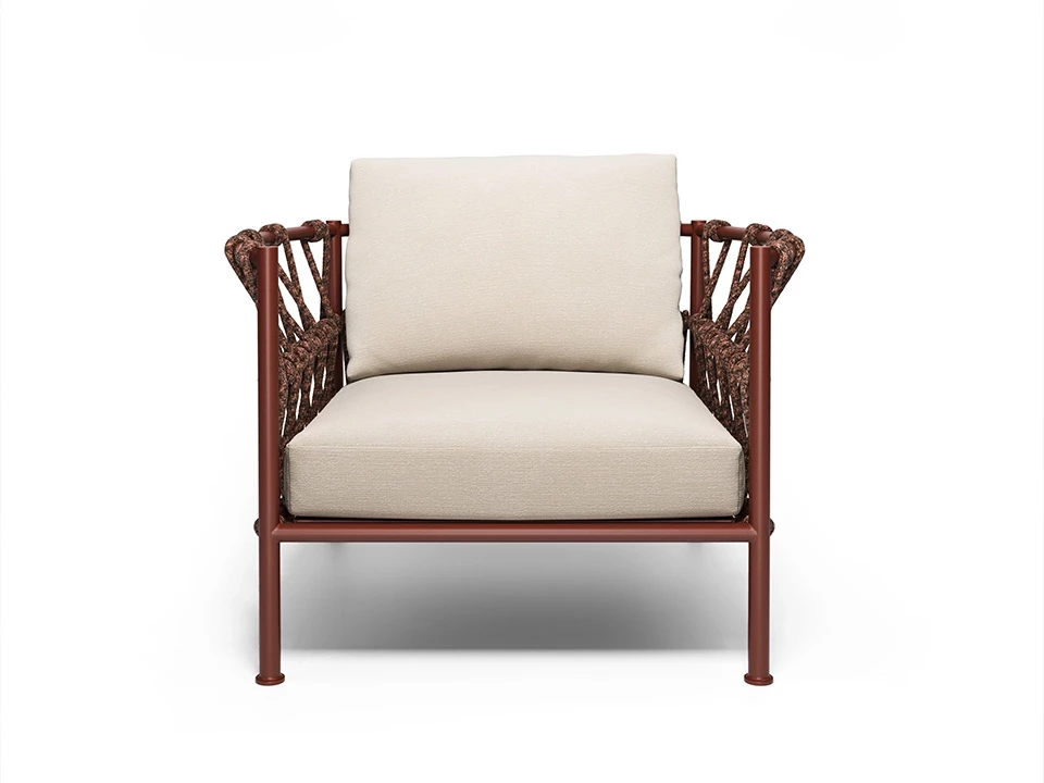 Ce fauteuil lounge enveloppant (collection Antigua) se distingue par son design aérien inspiré du mouvement des vagues, signé Federica Biasi. Sa couleur rouge intense lui confère une allure terracotta chaleureuse et solaire, parfaite pour réveiller une terrasse ou un bord de piscine.