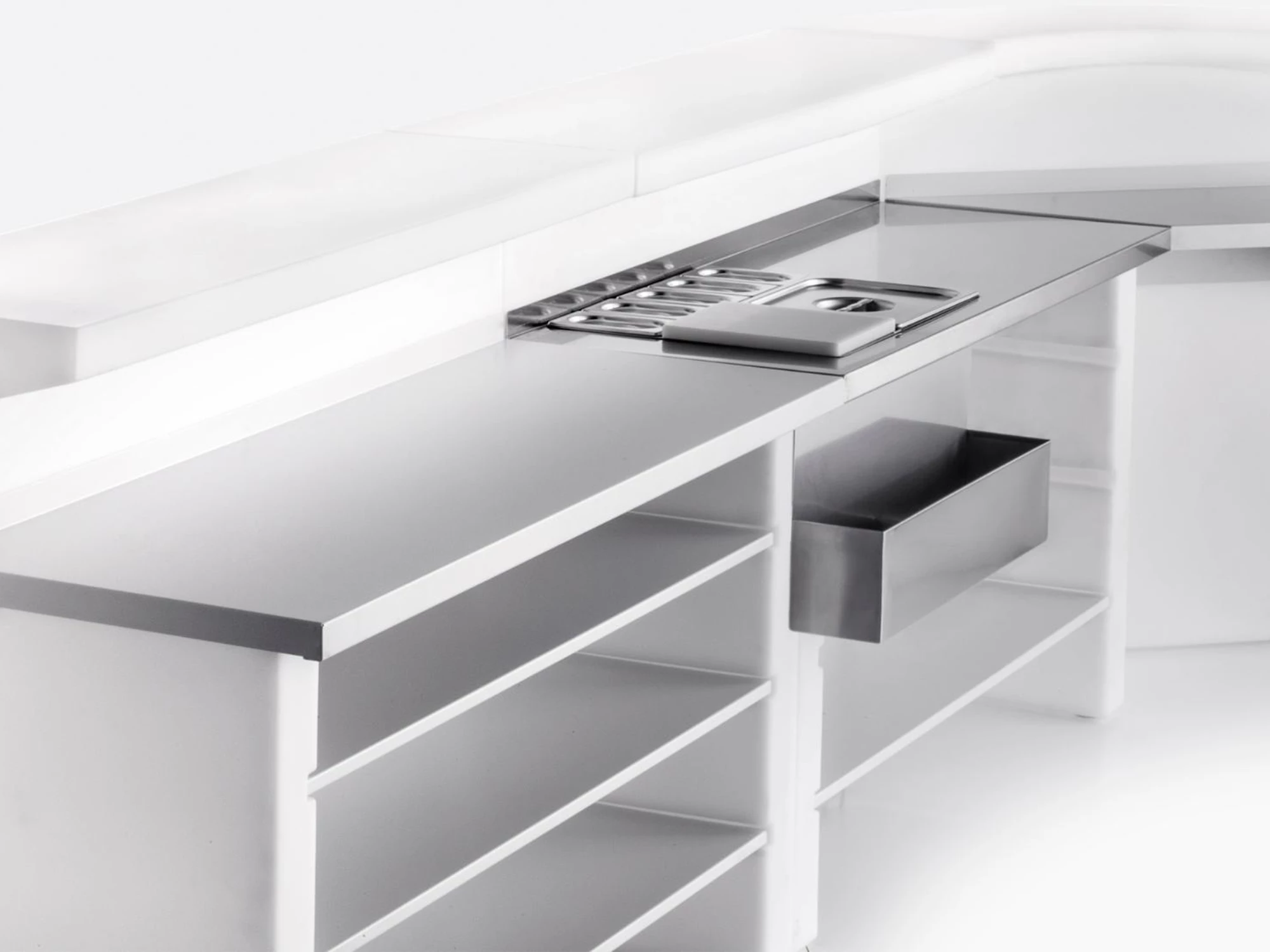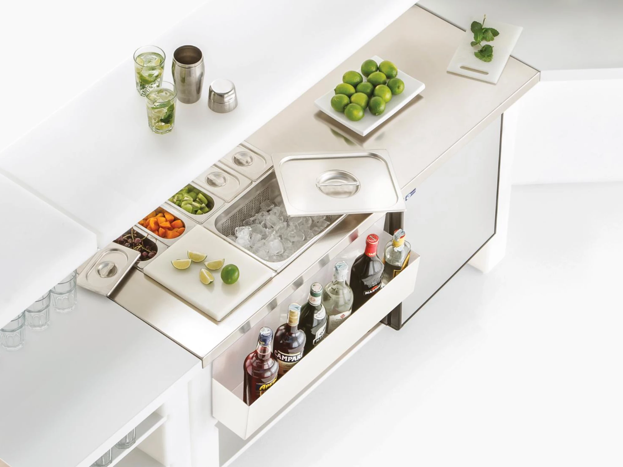 Le comptoir possède un plan de travail en acier inox avec des récipients de seau à glace, un bac porte-fruits un égouttoir avec kit de dégorgement, un porte bouteilles en acier époxy et une planche à découper en polyéthylène. Il y’a possibilité de rajouter des tablettes (3) ainsi qu’un éclairage.