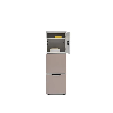 Découvrez notre armoire Locker avec une finition blanc pastel/gris clair. Ses dimensions sont les suivantes : Largeur : 402 mm, Profondeur : 432 mm, Hauteur : 1228 mm.