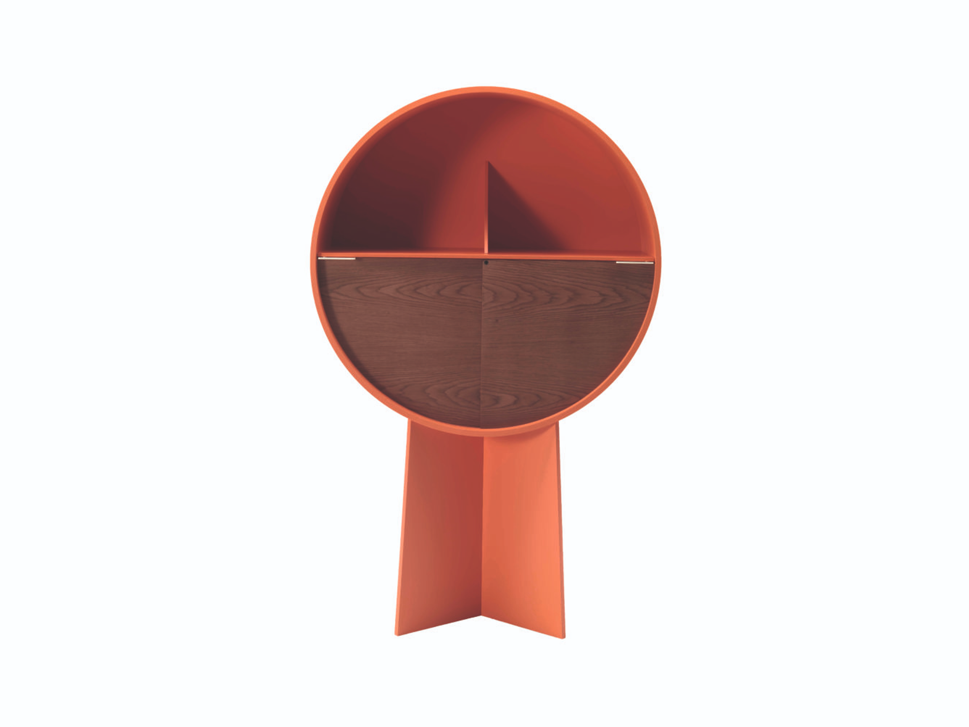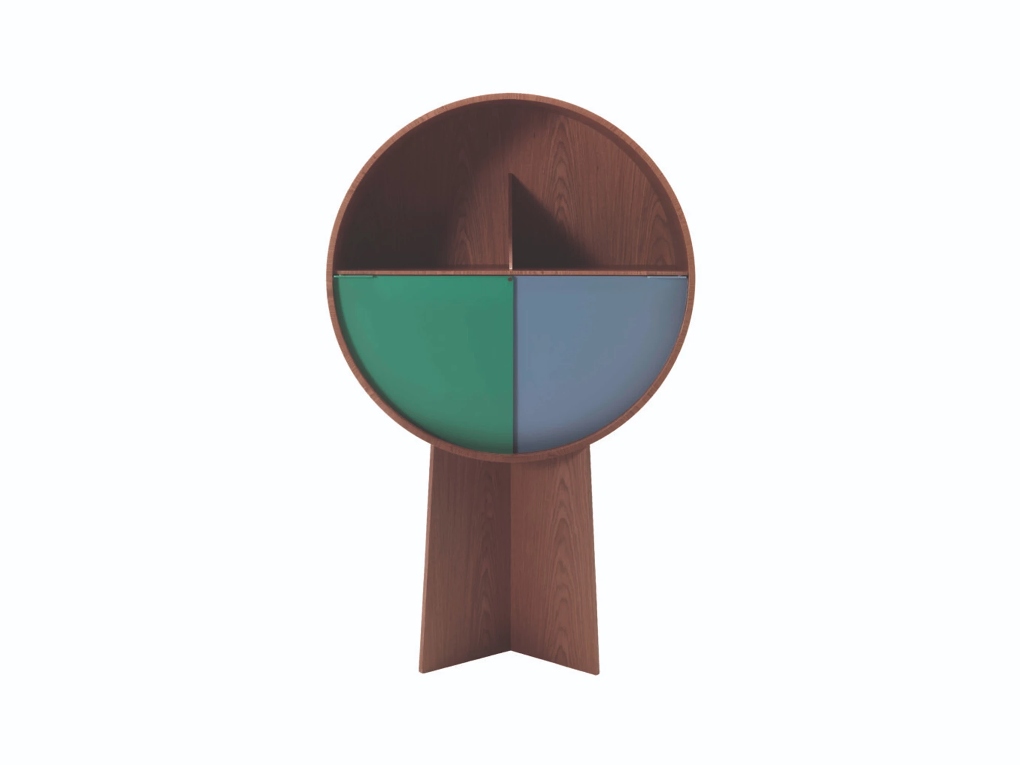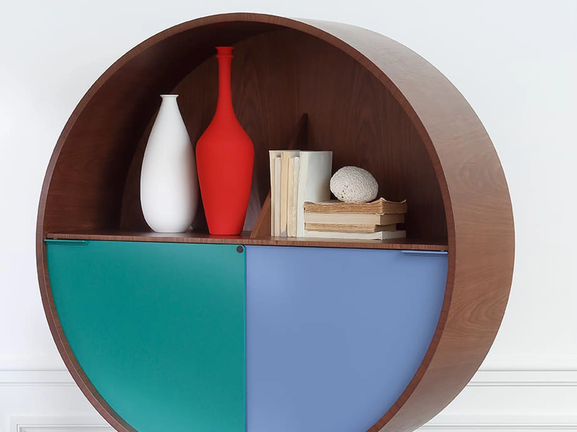 Le rangement circulaire aux proportions impressionnantes est divisé en deux parties. La partie haute permet d'exposer les objets que vous souhaitez mettre en valeur, tandis que le rangement du bas peut être dissimulé grâce aux deux portes coulissantes.