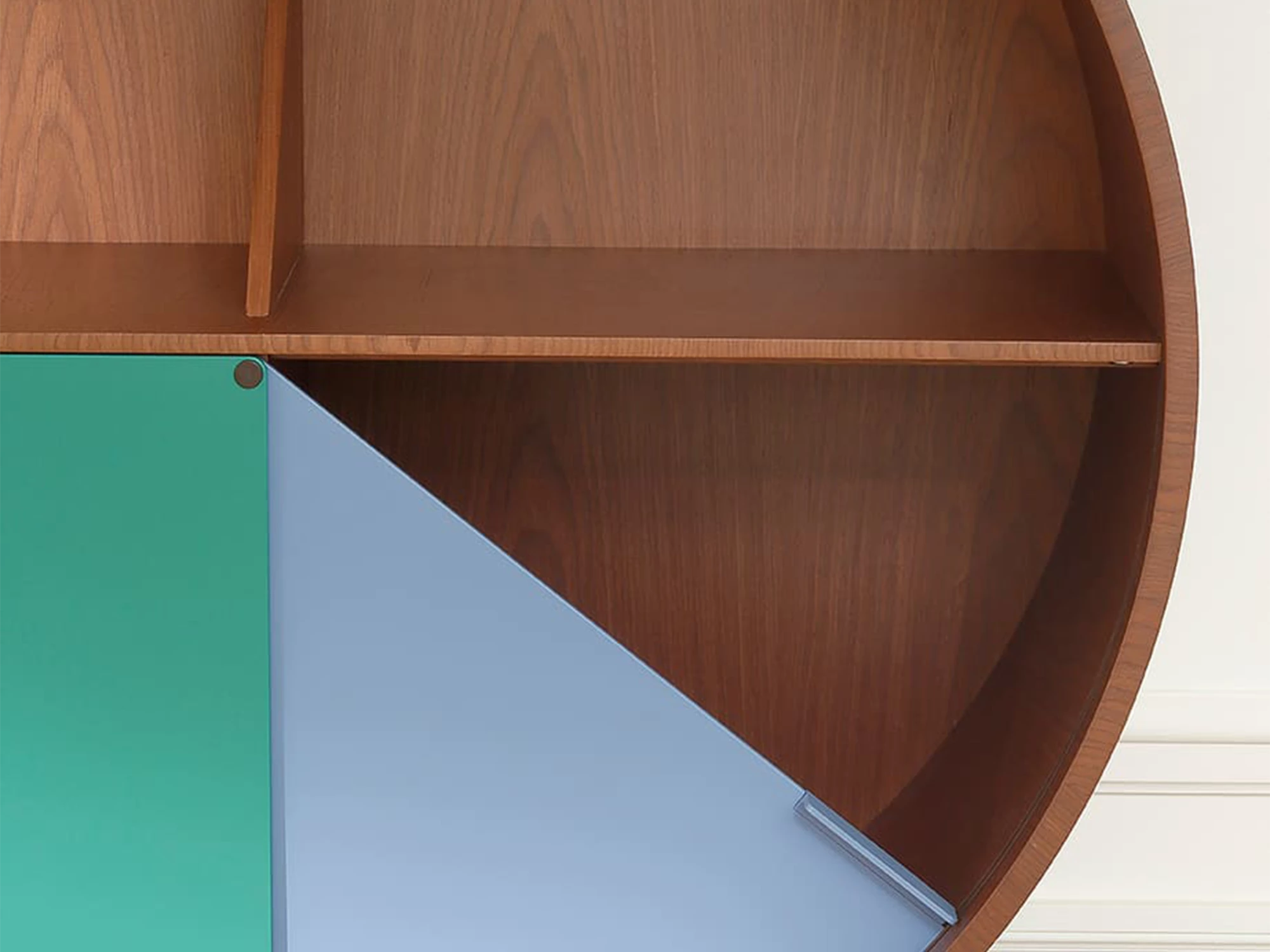 Le rangement Luna est disponible en deux versions : un modèle laqué orange avec des portes coulissantes en noyer et une version noyer associée à des portes teintées en vert et en bleu.