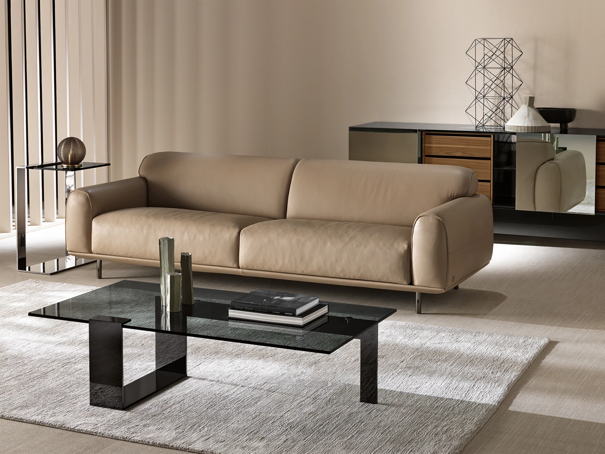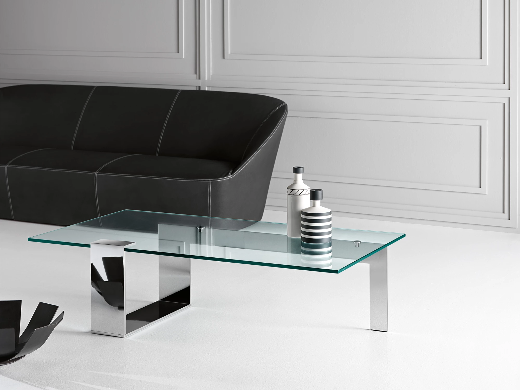 La table basse Plinsky, conçue par le designer Giulio Mancini, est composée par un plateau en verre trempé reposant sur un cadre en métal.