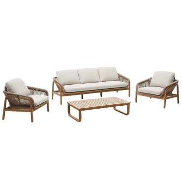 L'ensemble Vellana transforme votre extérieur en un espace de détente élégant et confortable. Composé d'un canapé 3 places spacieux, de deux fauteuils accueillants et d'une table basse harmonieuse, cet ensemble est idéal pour aménager votre terrasse, balcon ou jardin.