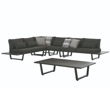 Ce salon de jardin d'angle propose des lignes modernes et contemporaines avec notamment la présence de pieds trapèze en métal noir. Les épais coussins en tissu Sunproof sont une invitation à venir se relaxer en extérieur.