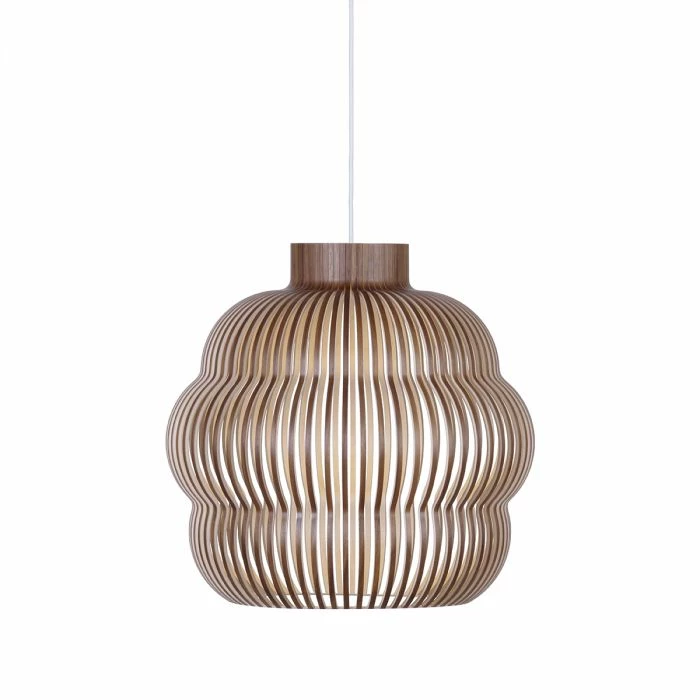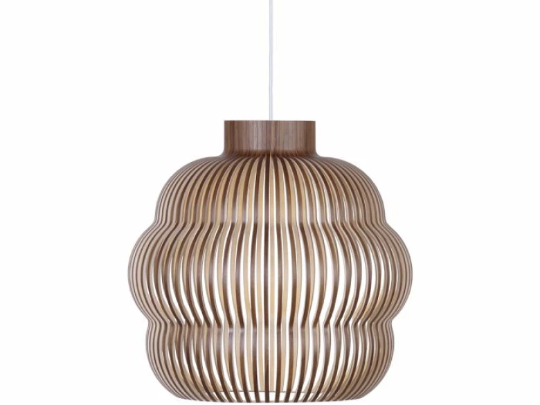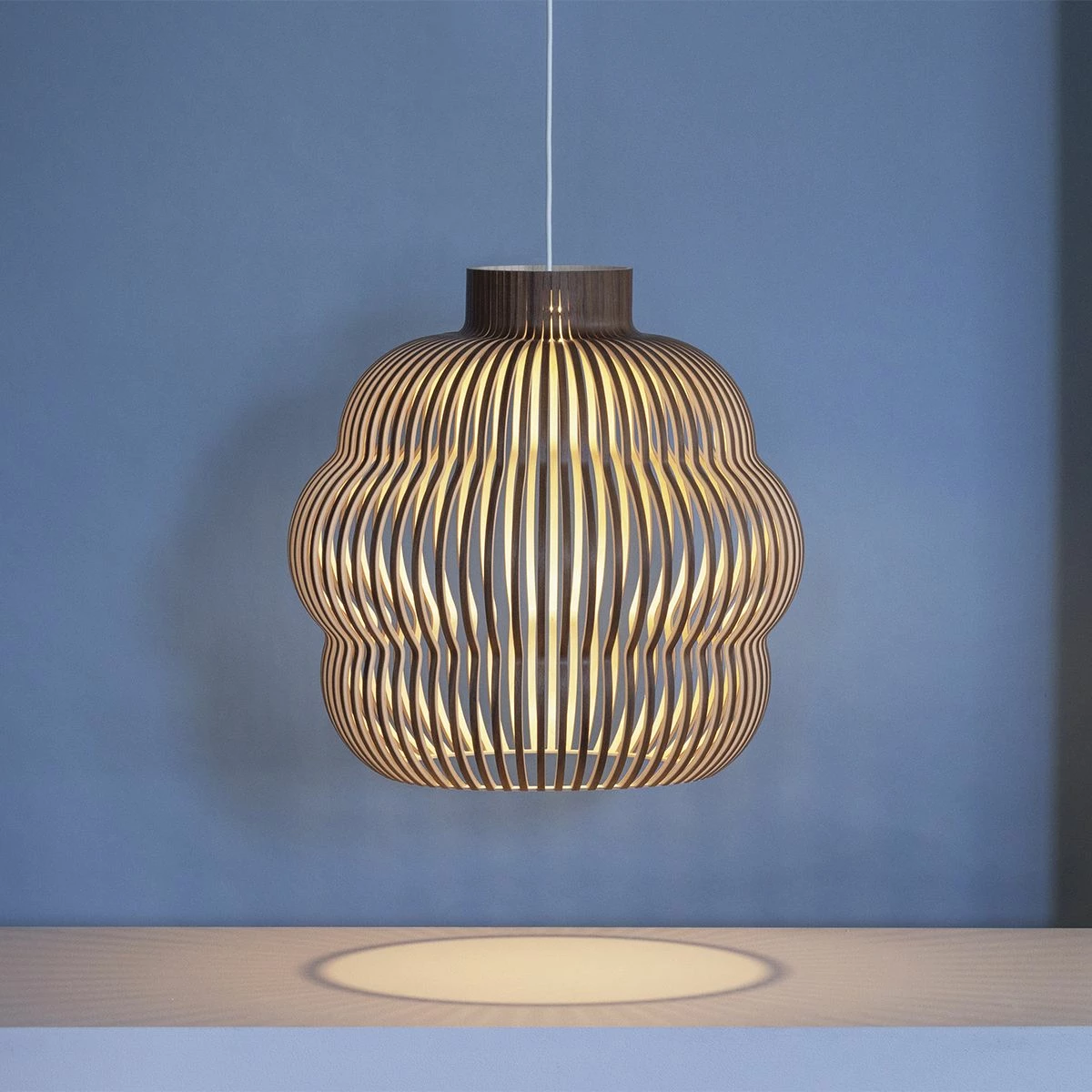 L'élégance intemporelle du Noyer. Cette version de la suspension Kumulo se distingue par son placage en noyer qui confère à l'objet une chaleur et une profondeur uniques. L'essence noble du bois sombre souligne les courbes organiques de la structure et crée un contraste saisissant une fois la lampe allumée. C'est la finition idéale pour apporter une touche de sophistication et une ambiance feutrée à votre intérieur, transformant le luminaire en une présence rassurante et luxueuse.