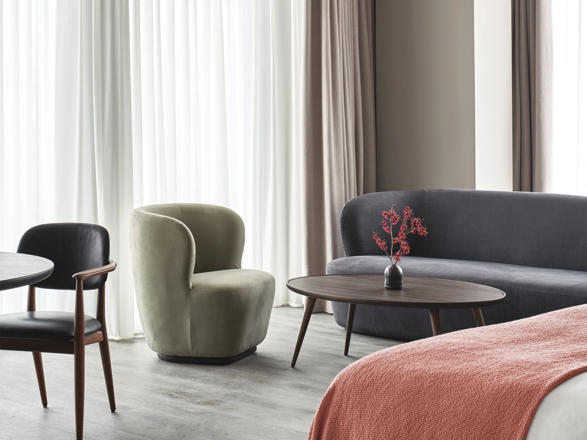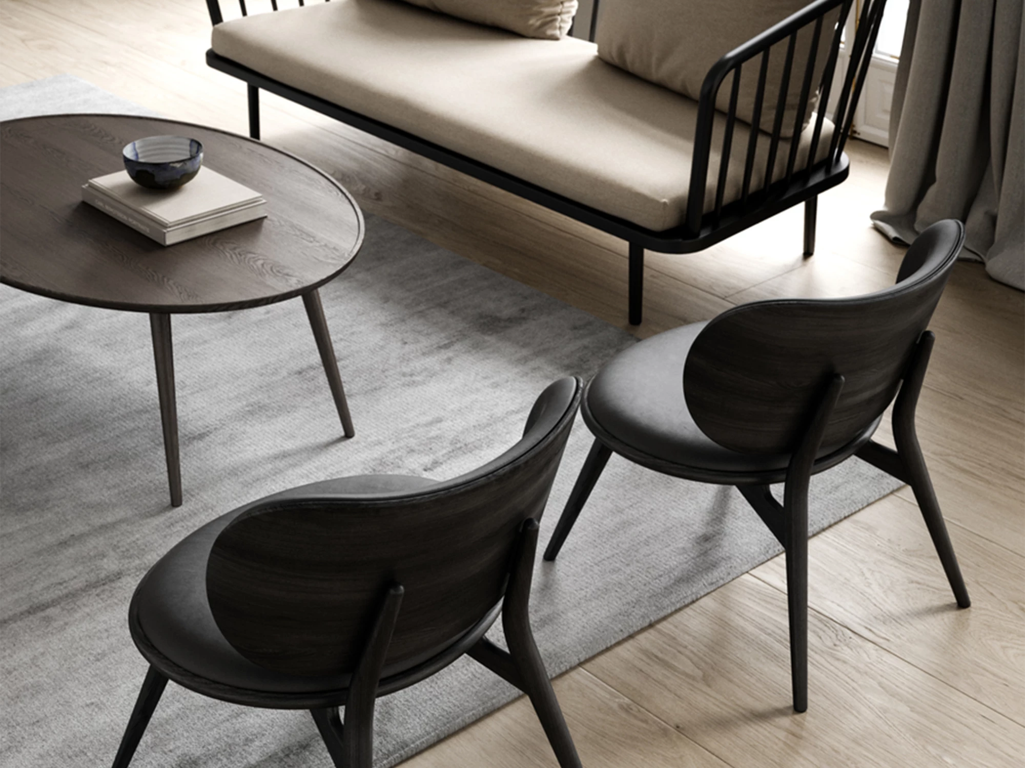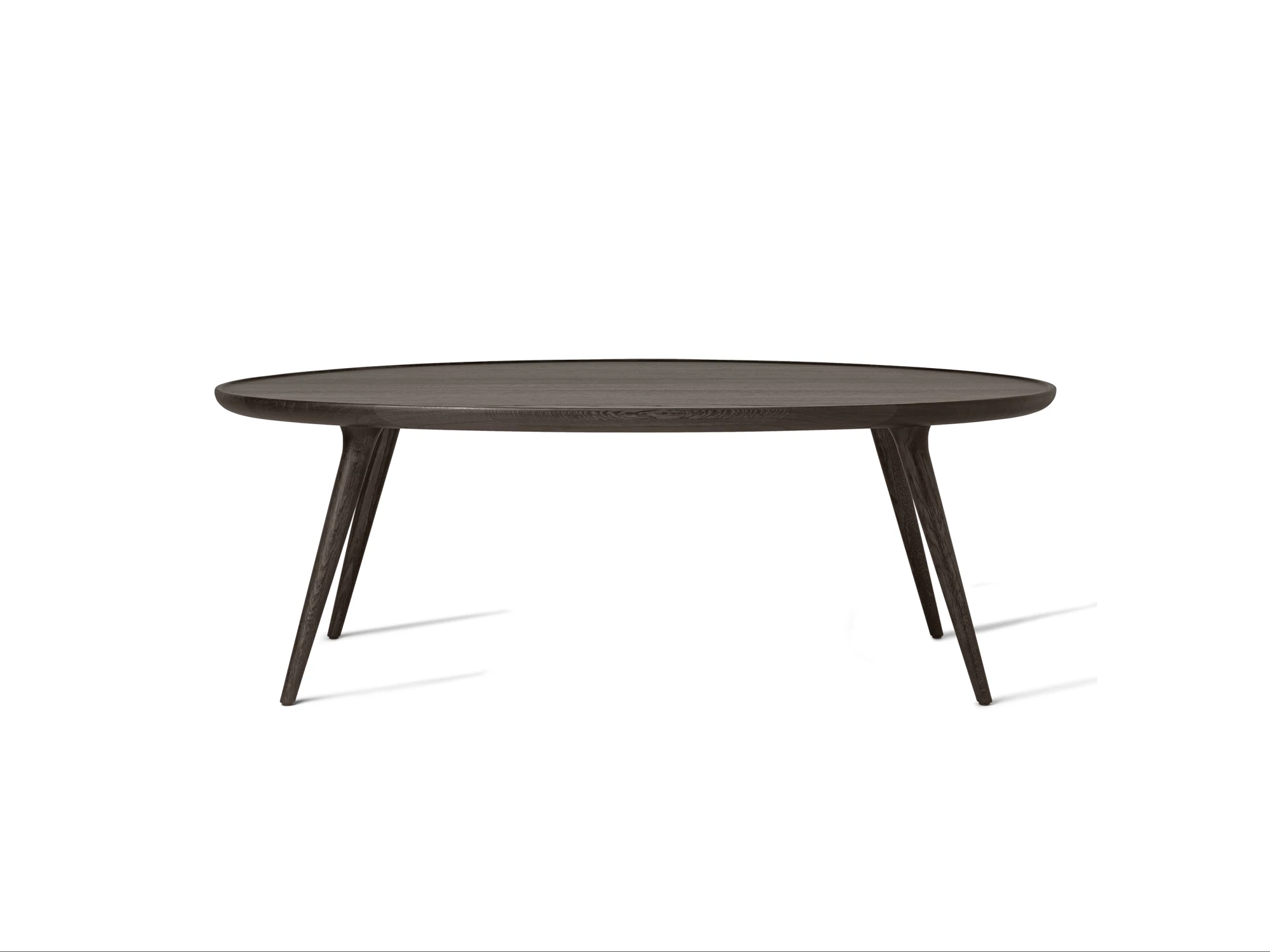 La table basse Accent est la combinaison d'un plateau rond au rebord légèrement relevé et de trois pieds fuselés en chêne massif certifié FSC. La jonction tout en finesse de ces deux parties donne l'impression que le projet a été sculpté dans un seul bloc.