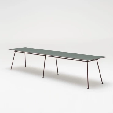 Le dernier ajout à la famille New School, la table type banc se distingue par son double plan de travail allongé, parfait pour accueillir de grands groupes. Disponible en longueurs de 2400 mm à 3600 mm, cette table est idéale pour les séances de travail en équipe, les réunions et les conférences. Conçue par Form Us With Love, elle conserve les caractéristiques distinctives de la gamme : formes simples, cadres en tubes courbés, plans de travail en lino et couleurs intenses.