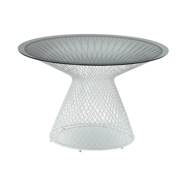 La table se distingue par son plateau en verre transparent qui, associé à l'entrelacement métallique de son piètement, crée une illusion de légèreté et d'immatérialité. Cette approche artistique et visionnaire donne naissance à une collection décrite par le designer lui-même comme un "manifeste d'élégance, entre glamour et sensualité hors du temps".