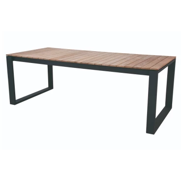 Le design moderne de la table Marcelo allie habilement l'élégance du teck naturel et la robustesse du métal noir. Les pieds en forme de U et la structure en aluminium noir confèrent un look contemporain et épuré, tandis que le plateau en lattes de teck naturel apporte une touche de chaleur et de nature à votre espace extérieur.